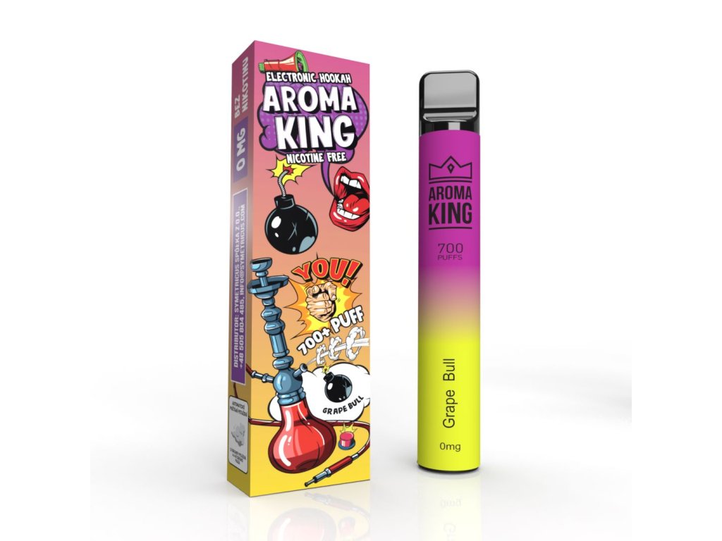 Jednorázová e-cigareta Aroma King Hookah 700+ Grape Bull je osvěžující mix sladkých hroznů a energetického nápoje s jemným nádechem kyselosti pro intenzivní a výraznou chuť.